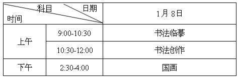考試時間安排與普高美術類相同。2017年1月2日考生憑《專業(yè)考試證》、第二代居民身份證到湖南師范大學工程與設計學院報到繳費,參加專業(yè)考試。