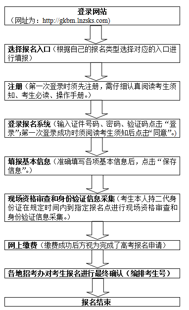 考生本人基本信息由考生本人于規(guī)定時(shí)間在網(wǎng)上按要求輸入,考生評(píng)語(yǔ)信息由報(bào)名點(diǎn)負(fù)責(zé)核準(zhǔn)并輸入;考生須在規(guī)定時(shí)間到指定報(bào)名點(diǎn)進(jìn)行現(xiàn)場(chǎng)資格審查和身份驗(yàn)證信息采集,交驗(yàn)各種證件,采集照片(面頰特征)及指紋特征信息,核驗(yàn)本人報(bào)名信息;考生報(bào)名資格審查合格后,須在規(guī)定時(shí)間完成網(wǎng)上繳費(fèi);各地招考辦根據(jù)考生填報(bào)信息、資格審查、網(wǎng)上繳費(fèi)等情況對(duì)考生報(bào)名進(jìn)行最終確認(rèn)(編排考生號(hào)),經(jīng)最終確認(rèn)的考生方視為完成報(bào)名,報(bào)名信息以各地招考辦最終確認(rèn)為準(zhǔn)。