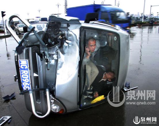 2005年4月12日下午,晉江電信大樓十字路口處,一輛面包車(chē)與皮卡車(chē)相撞,面包車(chē)當(dāng)場(chǎng)被撞翻倒地。在翻倒的小車(chē)內(nèi),司機(jī)被擠壓在下,車(chē)主狼狽地打著手機(jī),向外發(fā)出求救信號(hào)。