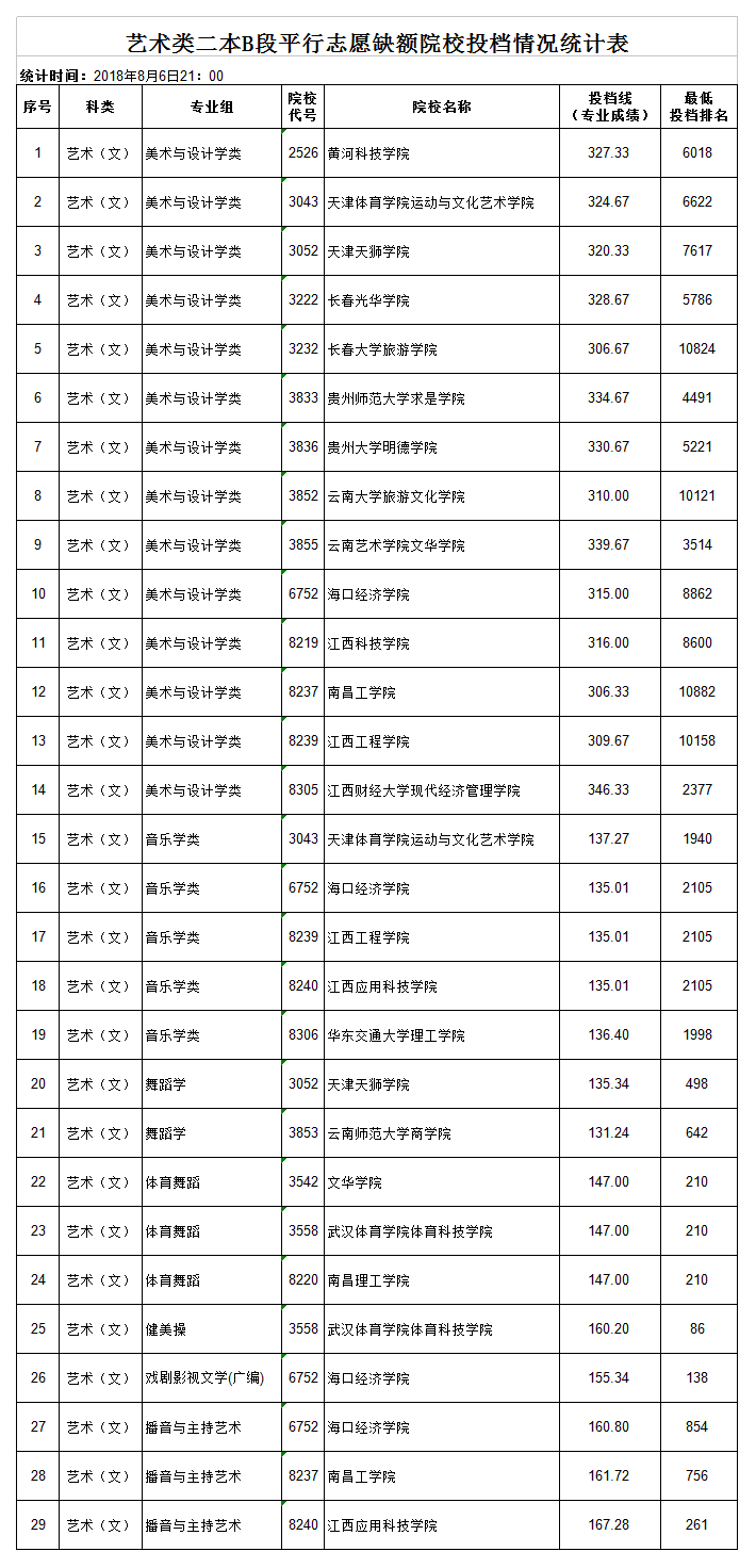 8月7日,記者從江西省教育考試院獲悉,2018年藝術類二本B段平行志愿缺額院校投檔線出爐!