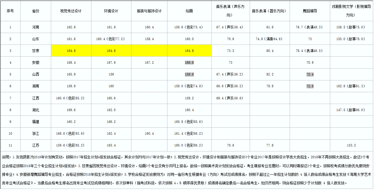 根據(jù)《教育部辦公廳關(guān)于做好2018年普通高等學(xué)校部分特殊類型招生工作的通知》(教學(xué)廳【2017】15號)、《海南大學(xué)2018年藝術(shù)類本科專業(yè)招生簡章》、11個(gè)校考省份上報(bào)合格考生信息通知和相關(guān)招生考試文件,確定海南大學(xué)2018年藝術(shù)類專業(yè)招生考試合格分?jǐn)?shù)線如下:
