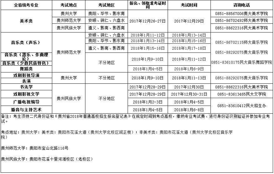 貴州省2018年普通高等學(xué)校藝術(shù)類(lèi)專(zhuān)業(yè)考試時(shí)間表