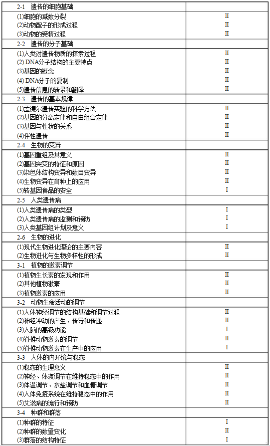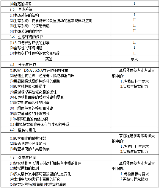 生物學(xué)科的考試范圍包括必考部分和選考部分,必考部分在課程標(biāo)準(zhǔn)必修模塊的范圍內(nèi),選考部分在課程標(biāo)準(zhǔn)選修模塊 1(生物技術(shù)實(shí)踐)和選修模塊 3(現(xiàn)代生物科技專題)的范圍內(nèi)。必考部分的試題是考生必做的,選考部分的試題需要考生在規(guī)定的選考內(nèi)容中選擇。生物學(xué)科的考試內(nèi)容以知識(shí)內(nèi)容表的形式呈現(xiàn)。知識(shí)內(nèi)容要求掌握的程度,在知識(shí)內(nèi)容表中用Ⅰ和Ⅱ標(biāo)出;實(shí)驗(yàn)內(nèi)容要求掌握的程度則用文字說(shuō)明。Ⅰ和Ⅱ的含義如下。
