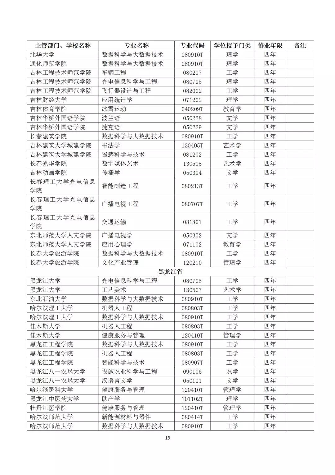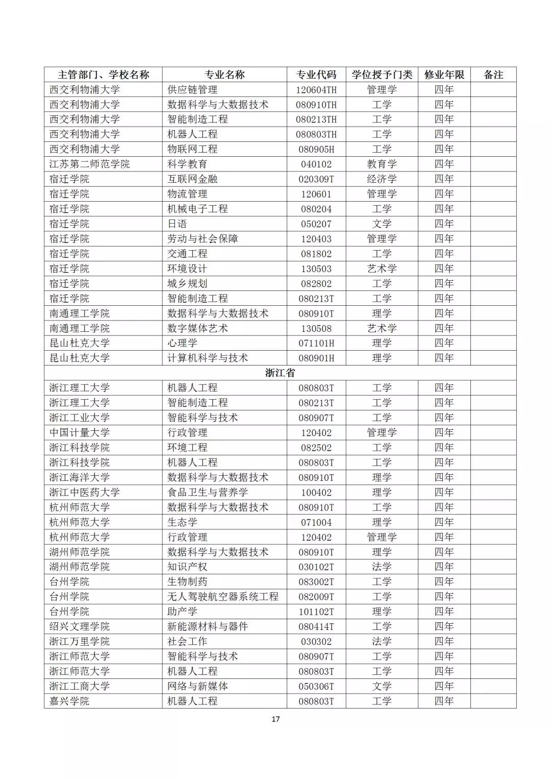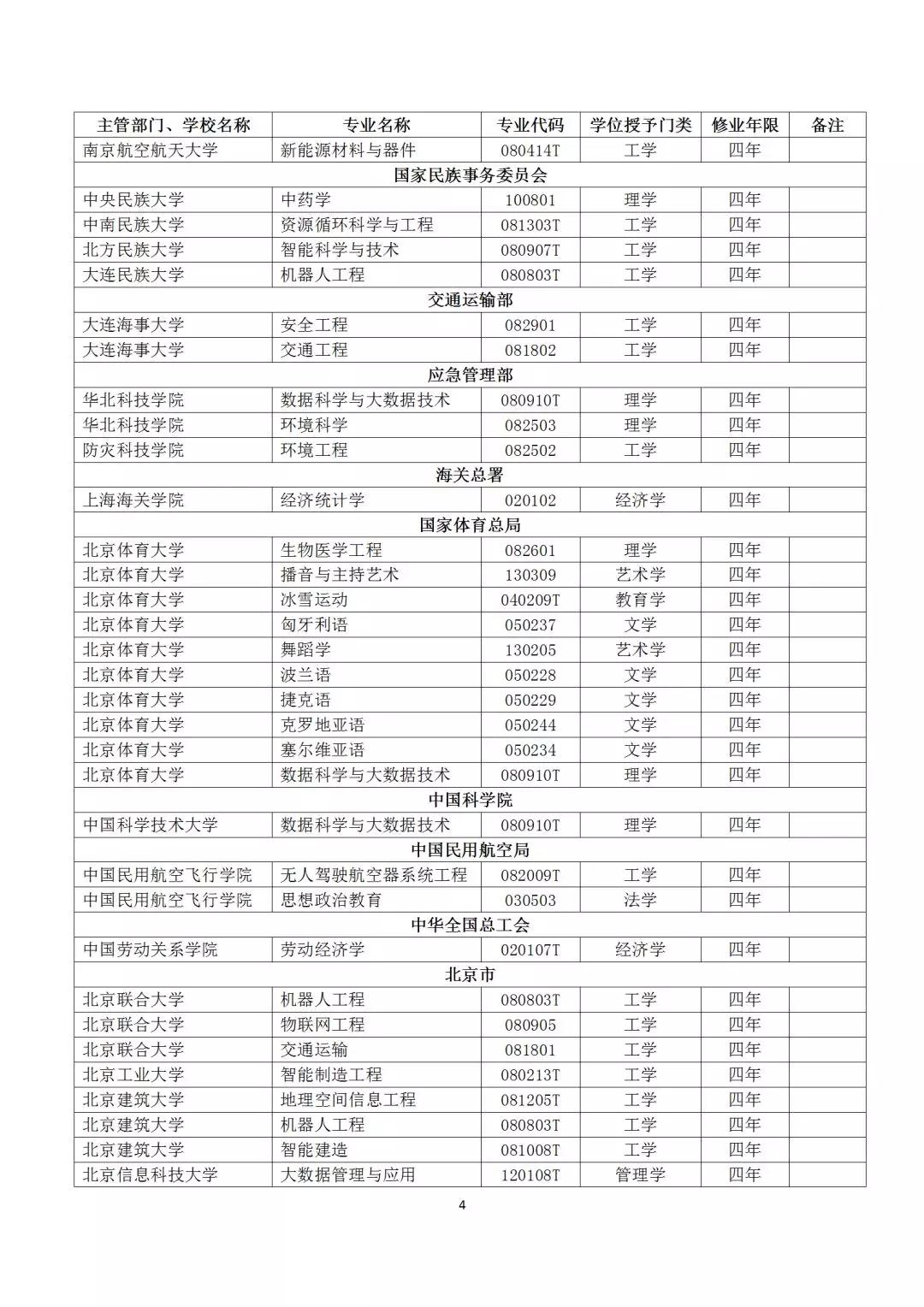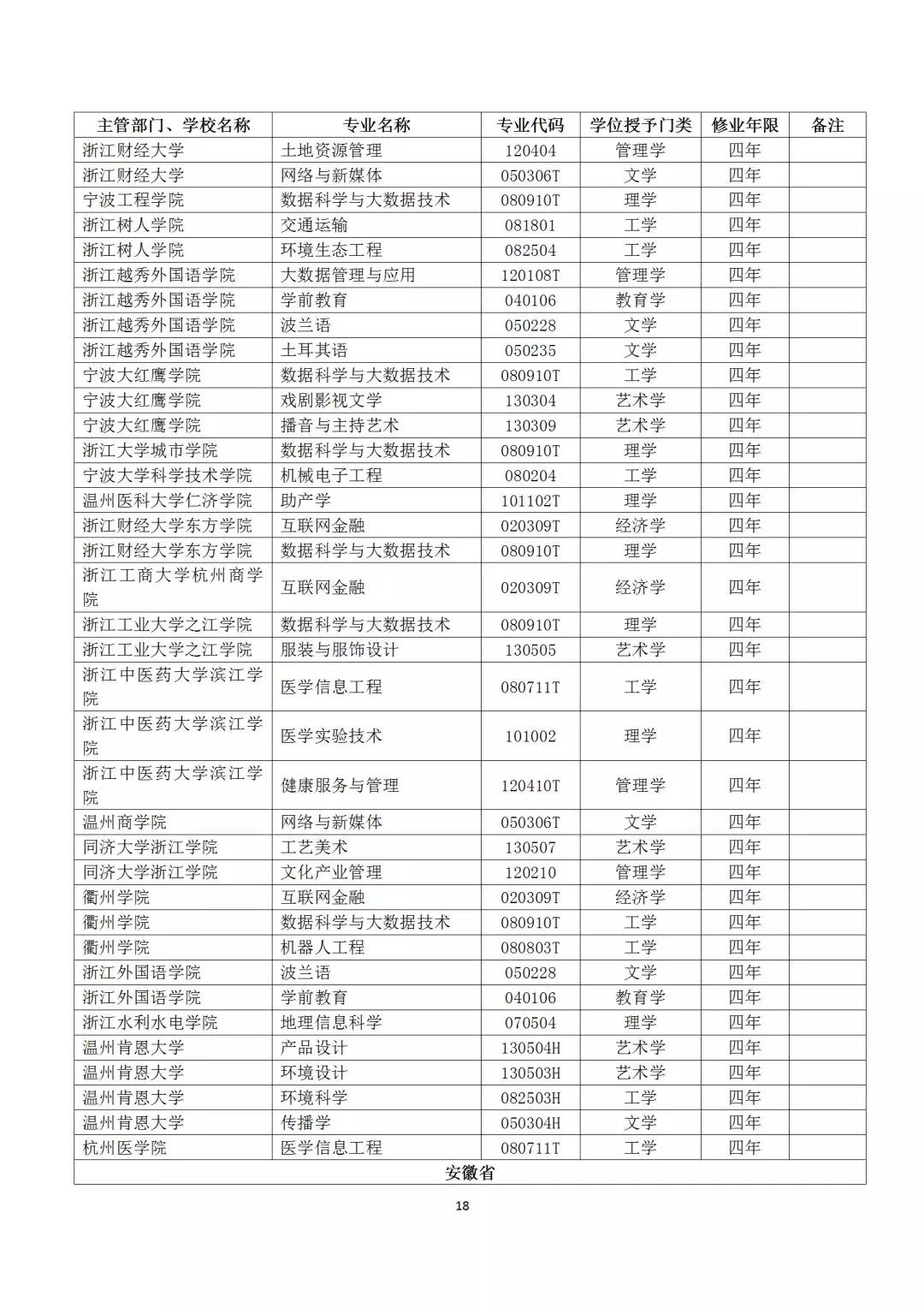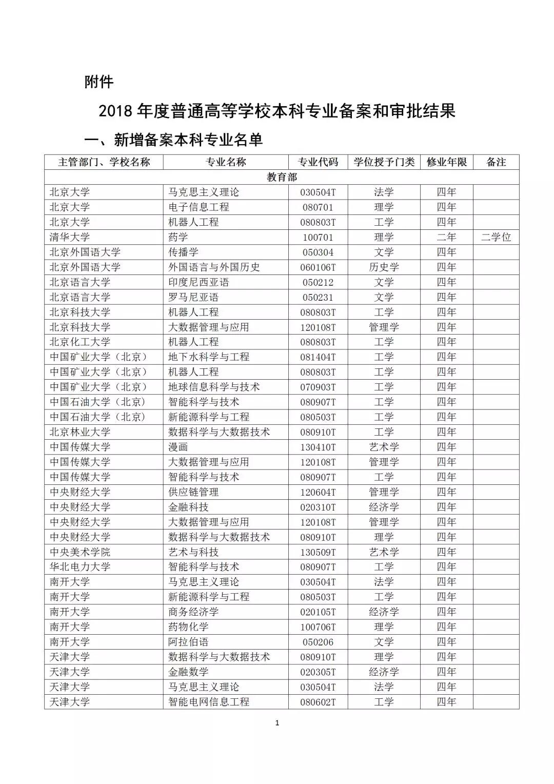 教育部公布2018年普通高校本科專業備案和審批結果的通知