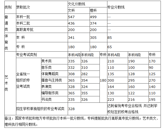 2018年河南省普通高校專升本招生錄取控制分數線(藝術類)