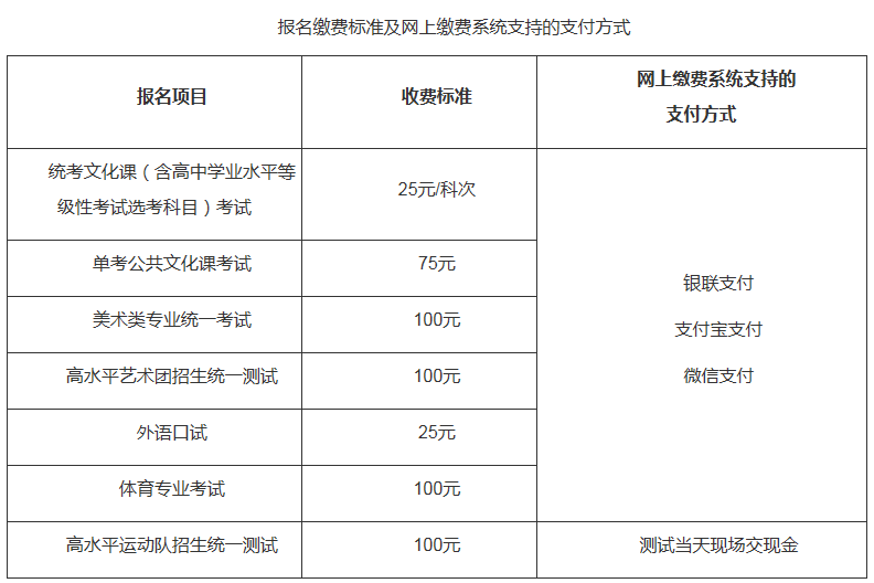 (四)2020年普通高等學(xué)校招生高水平藝術(shù)團(tuán)統(tǒng)一測(cè)試、美術(shù)類專業(yè)統(tǒng)一考試、外語(yǔ)口試、體育專業(yè)考試報(bào)名同期進(jìn)行,各項(xiàng)測(cè)試的時(shí)間安排見附件2,符合條件擬報(bào)名參加相關(guān)測(cè)試的考生須選報(bào)相關(guān)項(xiàng)目并繳費(fèi)。