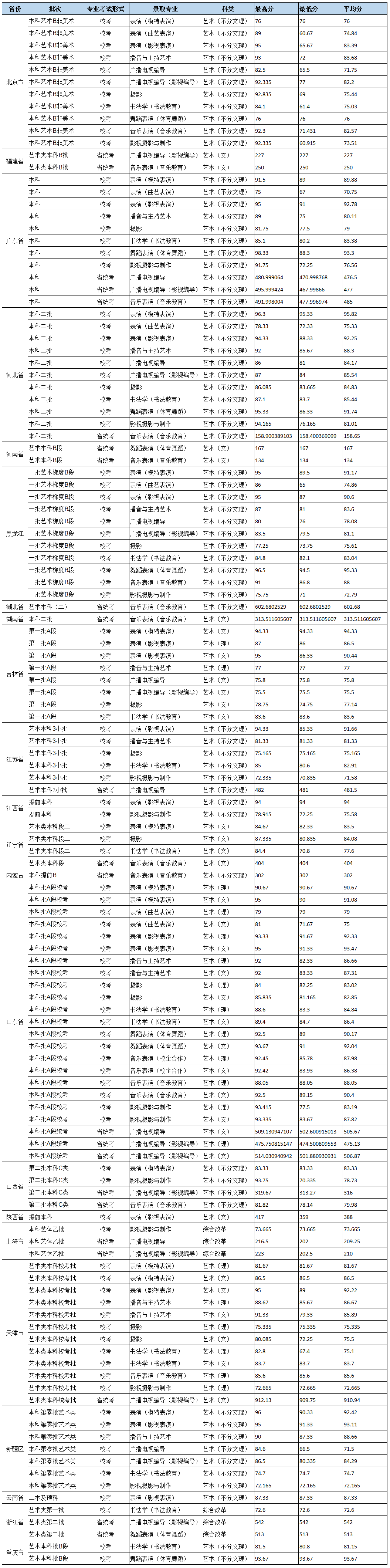 2、非美術類專業統計分數為專業課成績,對于使用統考成績的省市(除上海市),統計分數是按照各省規定折算后的投檔成績統計。