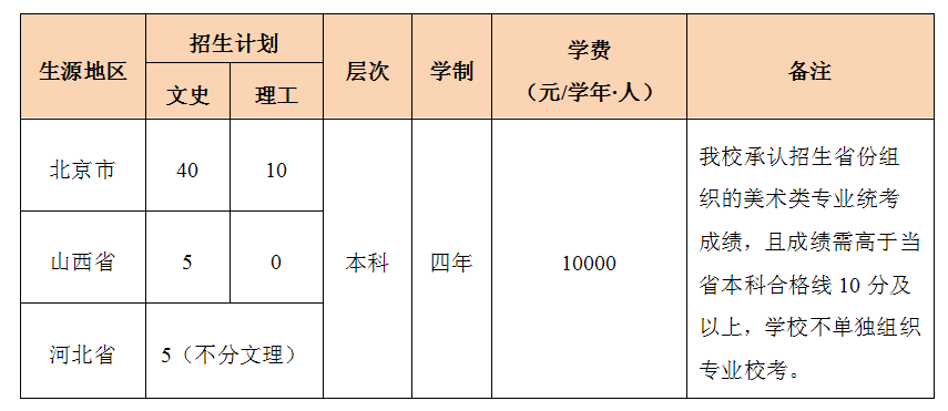 2017年我校藝術類環境設計專業面向北京、河北、山西3個省份招生60人,文理兼招,學制4年,具體如下: