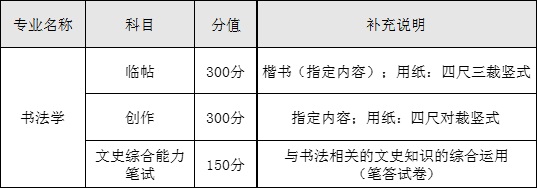 (3)初試內容:初試主要考查考生是否具備基本書寫能力以完成專業考試。初試時需提交本人近期獨立完成的作品一幅。作品的具體要求為:尺寸為四尺對裁豎式,落款并鈐印,作品左下角注明姓名及報名號,內容不限。初試結果將現場通知考生,初試成績不計入最終成績。
