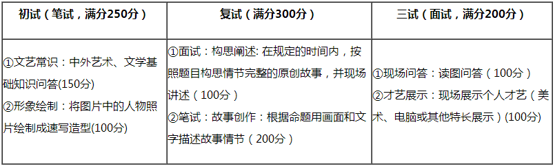 測試內容:素描(4開半身帶手寫生,300分)、速寫(8開場景速寫,150分)和色彩(4開色彩創意寫生,300分)。