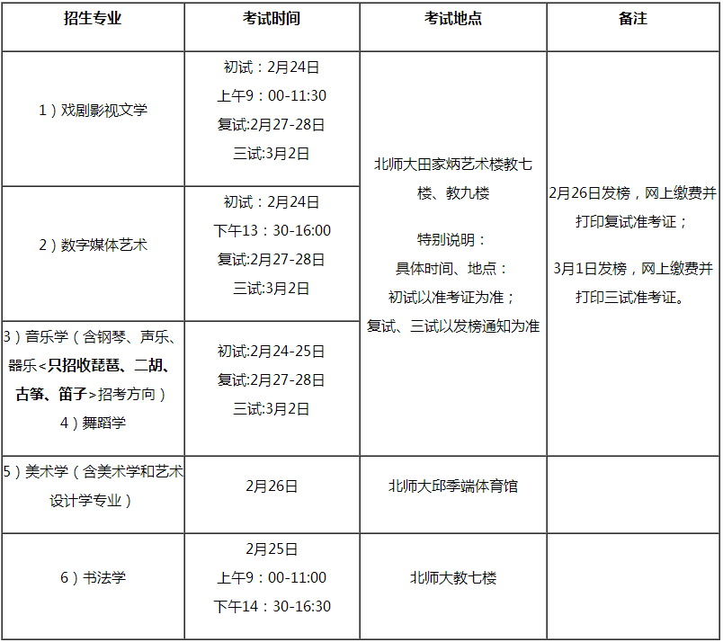 2017年12月26日-2018年1月19日音樂學和舞蹈學專業的考生須登錄網上報名系統自選初試時間段;書法學專業根據報名繳費時間系統自動安排考試時間;戲劇影視文學專業和數字媒體藝術專業統一安排初試時間。