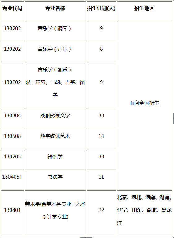 3. 美術學(含美術學專業、藝術設計學專業)面向北京、河北、河南、湖南、山東、遼寧、湖北和黑龍江省招生,在保證合格考生所在省份均有招生計劃的前提下,我校根據各省校考生源情況分配各省份招生計劃數。其余各專業(含招考方向)均面向全國招生,不編制分省分專業招生計劃。