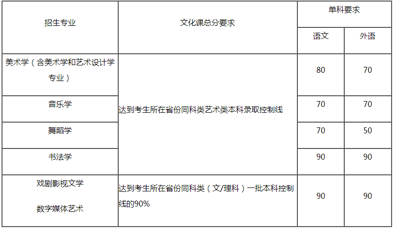 5. 各專業加設文化課單科(按滿分150 分計)和文化課成績總分(不含政策性加分,下同)錄取控制分數線,具體要求如下: