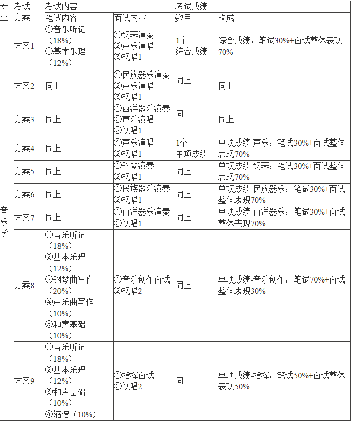 音樂(lè)學(xué)專業(yè)考試根據(jù)考試科目不同,共有9種方案。每種考試方案均包含筆試和面試。考生從9種方案中選擇一種進(jìn)行考試。