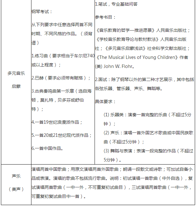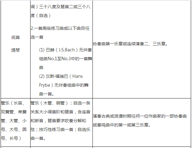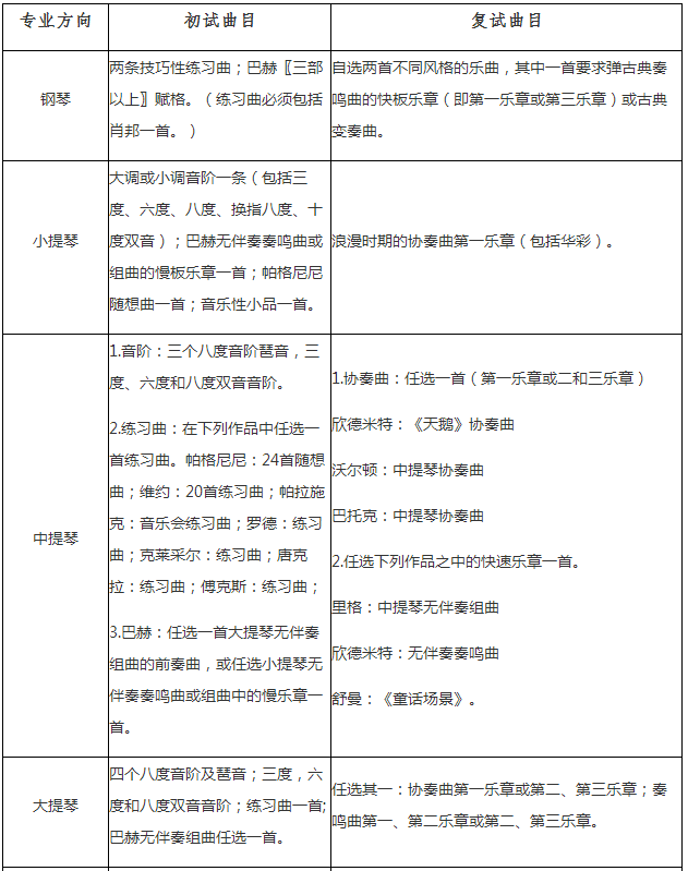 注:所有演奏(唱)專業曲目均須背譜;報名系統中填寫的曲目不可現場臨時更改,如測試演奏(唱)曲目與最終提交曲目不符的,將在測試評審時扣分;報考小提琴專業的考生可以兼報中提琴。