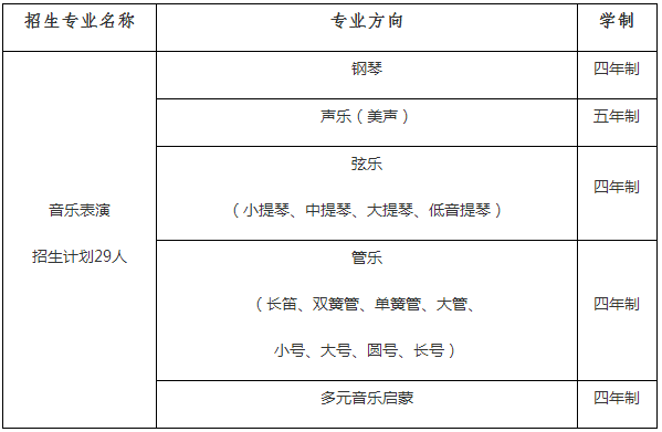 說明:音樂表演專業招生不做分省計劃。專業測試結束后,根據實際生源情況,堅持寧缺勿濫的原則,確定各專業方向的合格生人數。報考小提琴專業的考生可以兼報中提琴。