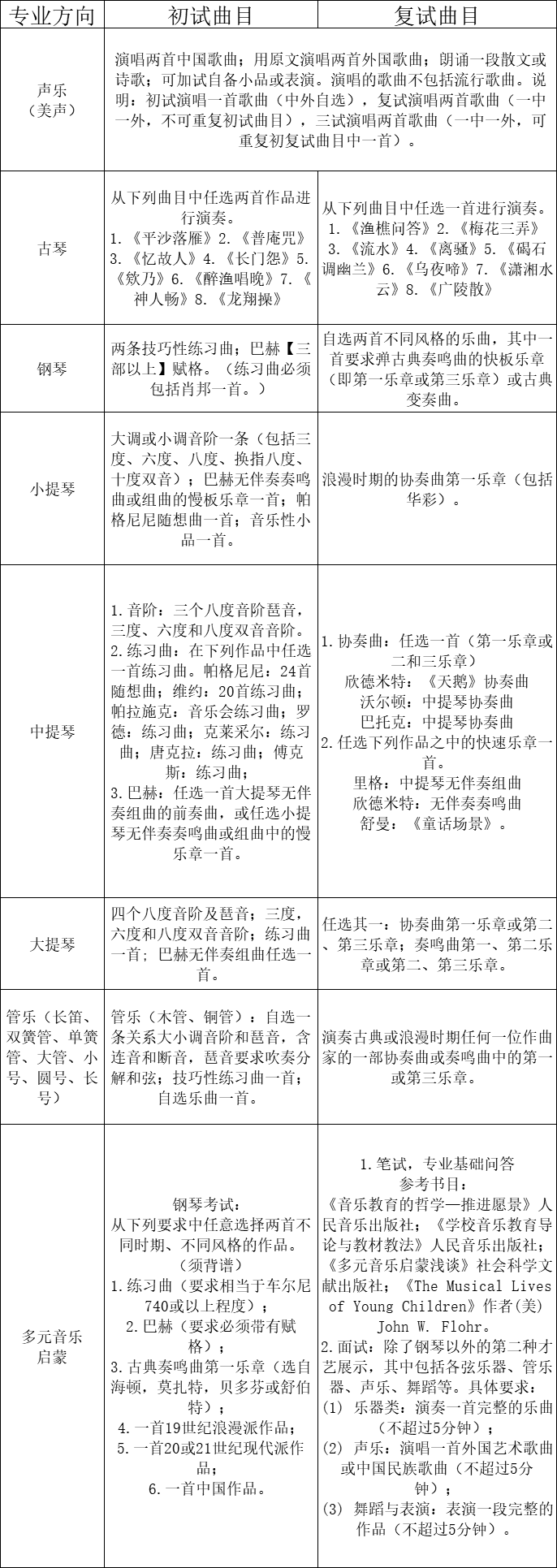 注:所有演奏(唱)專業曲目均須背譜;曲目信息在報名系統中填報后不可修改,如測試時演奏(唱)曲目與報名時填報曲目不符,評委將酌情扣分;報考小提琴且兼報中提琴專業的考生,考試內容按小提琴專業方向準備即可。