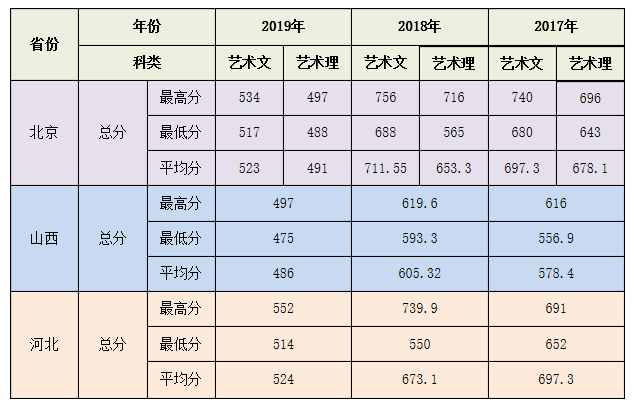 注:2019年總分為美術(shù)統(tǒng)考成績(jī)/300*750*50%+高考文化課成績(jī)(含政策性加分)*50%;2017-2018年總分為高考文化課成績(jī)加美術(shù)統(tǒng)考成績(jī)(含附加分)。