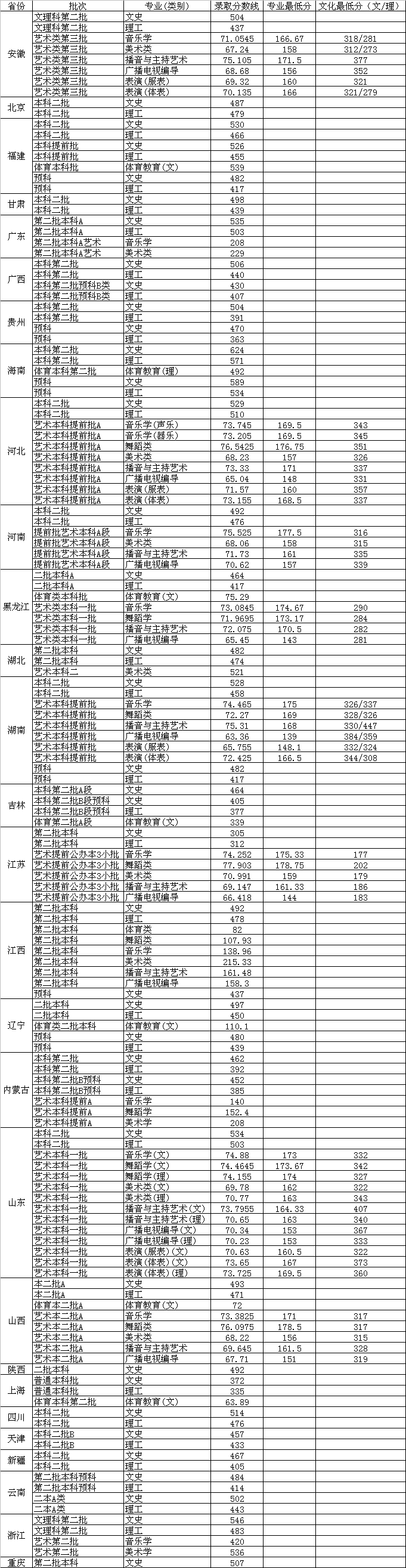 藝術類專業校考省份安徽(音樂舞蹈類、美術類、服裝表演、播音主持、廣電編、體育表演),河北(音樂舞蹈類、美術類、服裝表演、播音主持、廣電編、體育表演),河南(音樂舞蹈類、美術類、服裝表演、播音主持、廣電編),黑龍江(音樂舞蹈類、播音主持、廣電編),湖南(音樂舞蹈類、服裝表演、播音主持、廣電編、體育表演),江蘇(音樂舞蹈類、美術類、服裝表演、播音主持、廣電編),山東(音樂舞蹈類、美術類、服裝表演、播音主持、廣電編、體育表演),山西(音樂舞蹈類、美術類、播音主持、廣電編)
