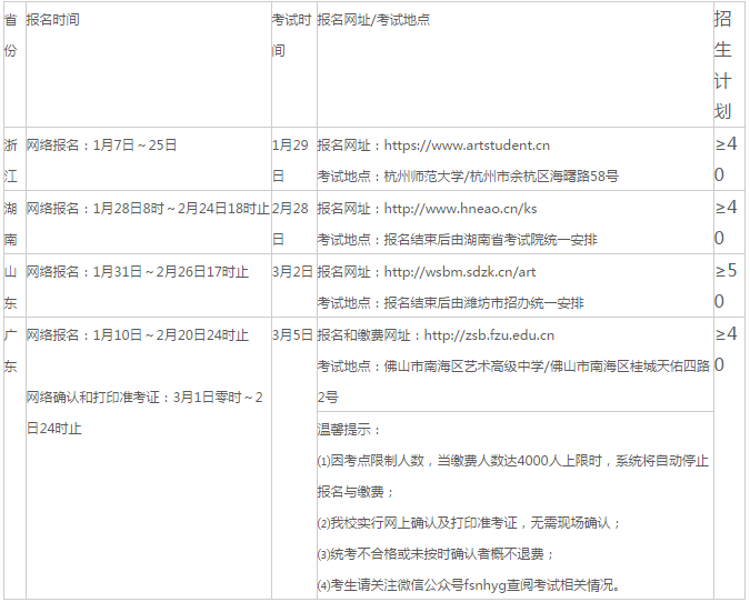 特別說明:以上校考省份文理兼收,校考成績各專業通用(不分專業報考,取得我校專業合格證后,待高考填報志愿時再選擇專業);考試科目為素描和色彩;按分省招生計劃1:4以內發放合格證;考生不得跨省報考;根據閩價費〔2015〕267號文件規定,我校報名測試費為170元/人。