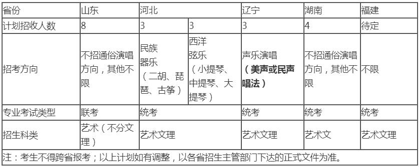 河北、遼寧、湖南、福建等地考生參加所在省2020年音樂類專業統考(考試科目以當地招生主管部門公布為準),我校不再另行舉行專業測試。