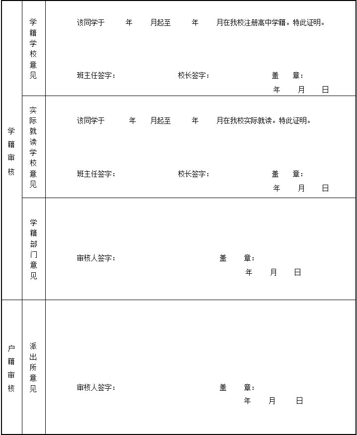 (一)報名資格審查工作要嚴格按照我省五部門聯合下發的《報名工作規定》執行。公安部門負責審查考生的戶籍和民族成份;主管學籍的教育行政部門負責審查考生的學籍;民族事務部門負責考生民族成份更改的管理及審批;縣級招生辦公室根據考生和相關部門提供的材料,負責審查各類考生的報名資格;紀檢監察部門監督檢查教育、公安、招生考試機構等部門對考生報名資格審查及執行政策和紀律的情況。