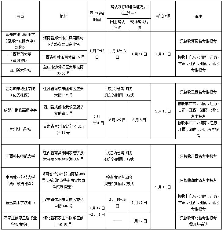 1、我校各美術類校考專業(除美術學專業、書法學專業)在廣東省外設有十個考點,分別安排在三個時間段組織考試,考點安排如下: