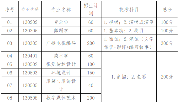 音樂學、舞蹈學、廣播電視編導、美術學、視覺傳達設計、環境設計、服裝與服飾設計、數字媒體藝術,學制四年,文理兼招,授予藝術學學士學位。