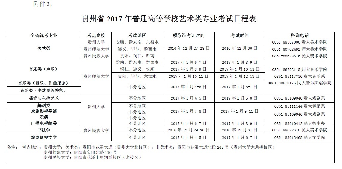 2、專業考試時間、地點詳見貴州省招生考試院網站發布的《貴州省2017年普通高等學校藝術類專業考試日程表》。