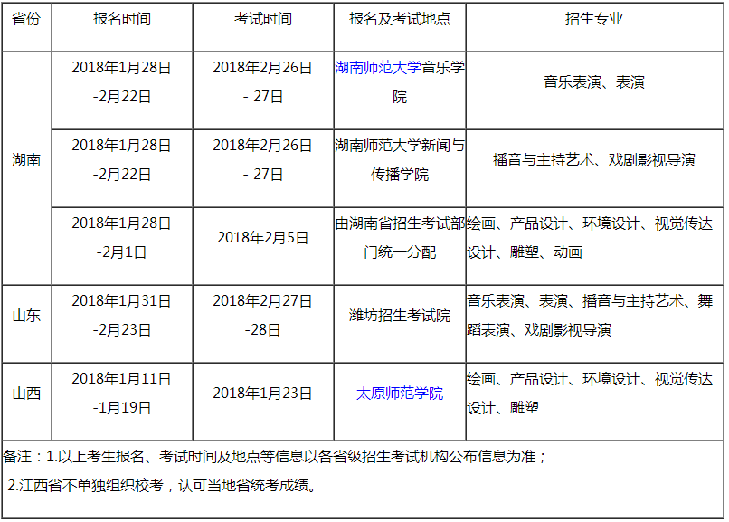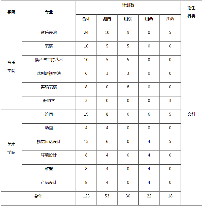 音樂學院各招生專業在湖南、山東設校考,美術學院各招生專業在湖南、山西設??迹魇〔辉O校考,認可當地省統考成績。校考科目及要求如下: