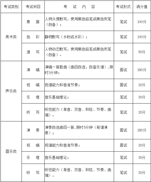 各類別考試科目、形式、內容及分值詳見《海南省2017年藝術類專業統一考試科目、內容及分值表》(附件2)。各考試類別均不進行復試。
