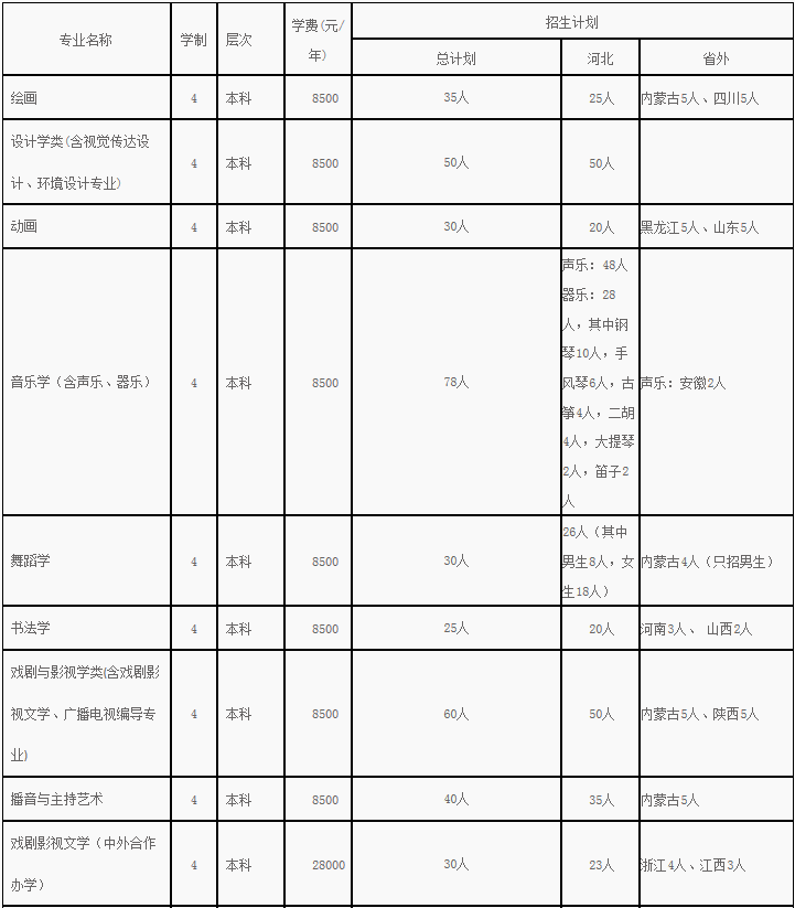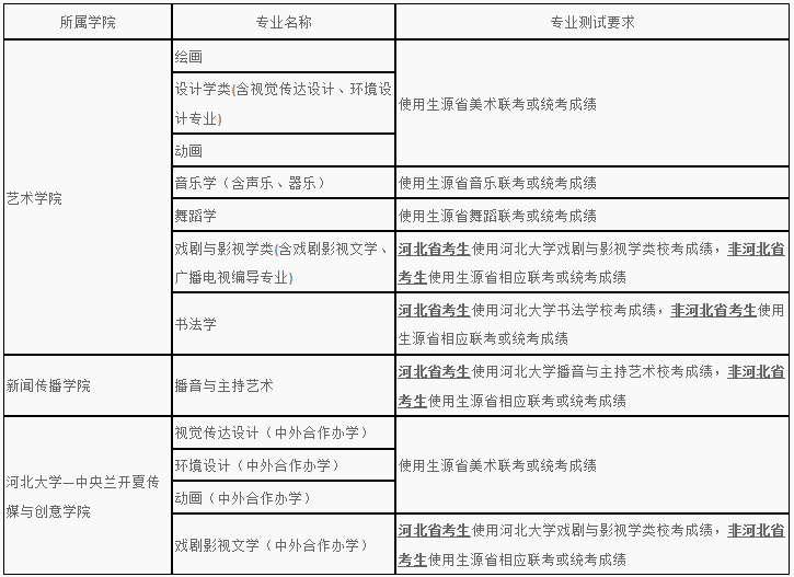 戲劇與影視學類(含戲劇影視文學專業、廣播電視編導專業)、播音與主持藝術專業、書法學專業測試河北省考生采用河北大學校考成績、非河北省考生采用生源省相應的藝術聯考(或統考)成績。