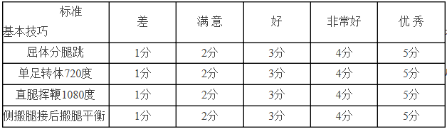 1.基本技術:基本動作完成質量,平衡、流暢、基本姿態等;20分