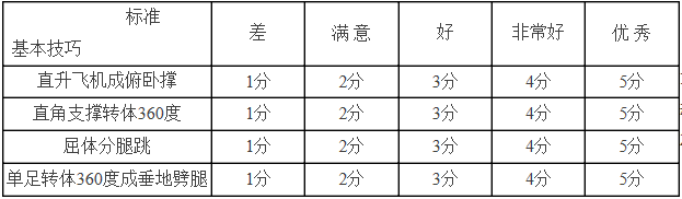 考生需展示直升飛機成俯臥撐、直角支撐轉體360度、屈體分腿跳、單足轉體360度成垂地劈腿。