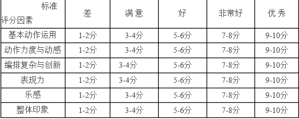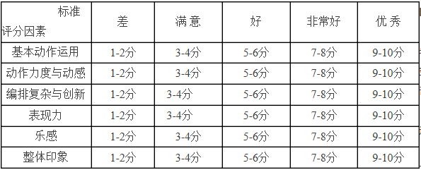 1. 形體勻稱、上下肢比例好,選跳的組合程度較難,動作熟練而細膩,動律、風格把握準確,節奏準確樂感好,有較強的表演能力和肢體語言表現力,體育舞蹈氣質、形象佳。(90—100分)