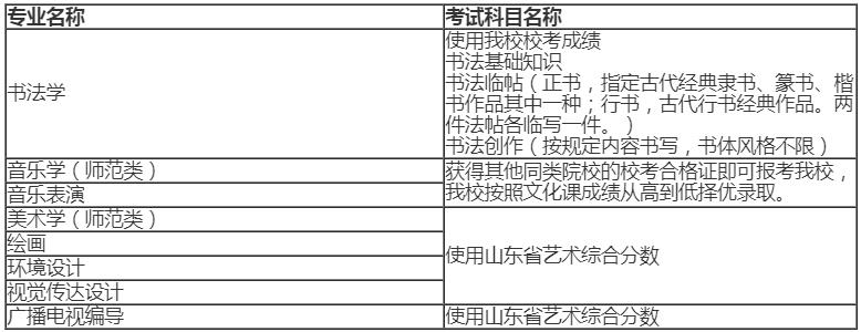 5、校考專業(yè):書法學(xué)(音樂學(xué)、音樂表演專業(yè)使用其他同類院校校考成績,廣播電視編導(dǎo)、美術(shù)學(xué)、繪畫、環(huán)境設(shè)計(jì)、視覺傳達(dá)設(shè)計(jì)、工藝美術(shù)專業(yè)使用山東省藝術(shù)綜合分?jǐn)?shù))