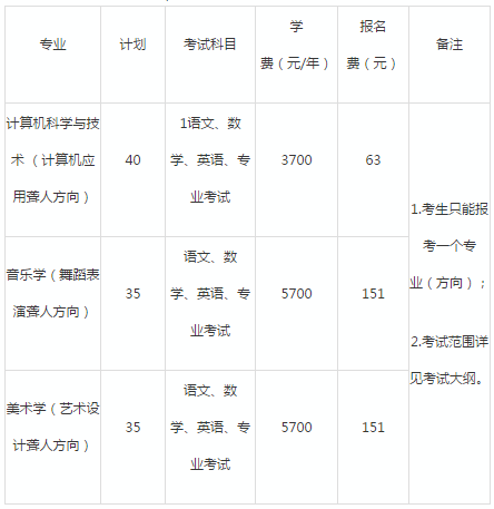 2.音樂學(舞蹈表演聾人方向)、美術學(藝術設計聾人方向)專業錄取時按照(文化成績×30% +專業成績×70%)的計分方法排序,從高到低錄取,完成招生計劃;