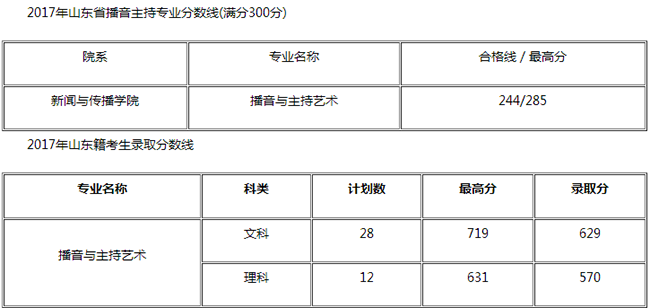 2017年山東省播音主持專業(yè)分數(shù)線(滿分300分)