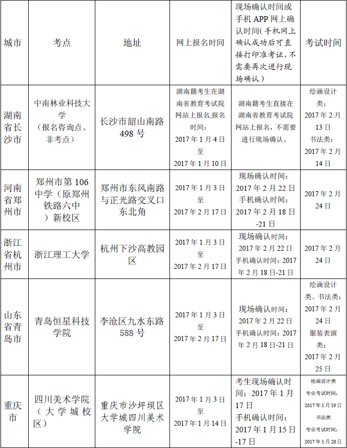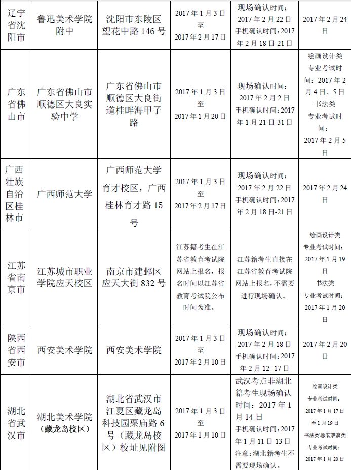 省外考點截止時間:見《湖北美術學院2017年普通本科招生專業考試考點設置及報名考試時間安排》(江蘇籍、湖南籍考生在生源地所在省份教育考試院統一藝術類校考報名網站報名)。