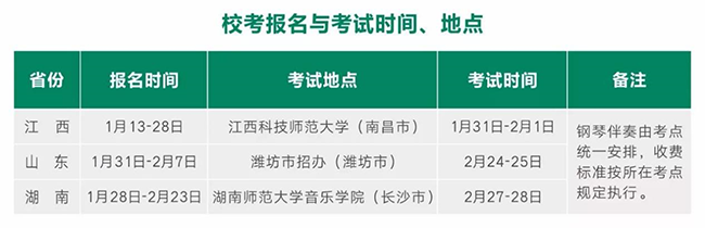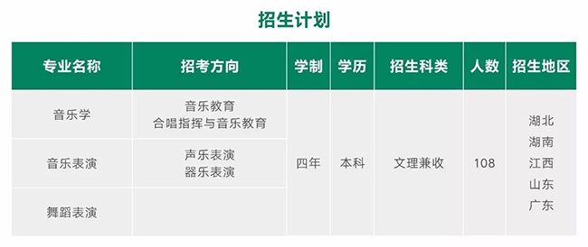 專業統考:湖北省、廣東省考生須參加所在省相應音樂、舞蹈類全省統一考試,統考成績即為報考我校的專業成績。