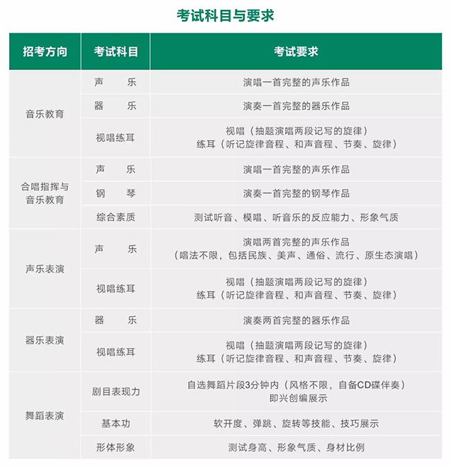 1、音樂教育、器樂表演方向:男生1.65米(含)以上,女生1.55米(含)以上。
