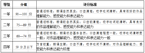 通過考生的朗誦,考查考生的聲音條件和語言的規范程度,對作品思想內容的理解能力,對作品意境、情感和所塑造人物形象的感受能力、表現能力。