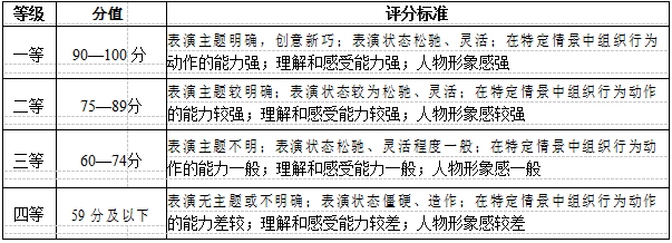考查考生能否建立適當的環境和人物關系,明確各自的角色和任務,能進行良好的互動并能很快地適應不斷變化的情境。按照生活邏輯展開合理的藝術想象,準確、生動的演繹表演主題。