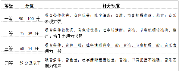 考生清唱自選歌曲、戲曲唱腔或曲藝作品一首,風格不限,考試時間 2 分鐘以