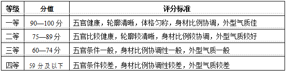 考查要素:①五官;②身材;③形象;④氣質。要求身材勻稱、比例協調,五官健康正常,氣質較好,大方得體,生理心理狀態穩定。