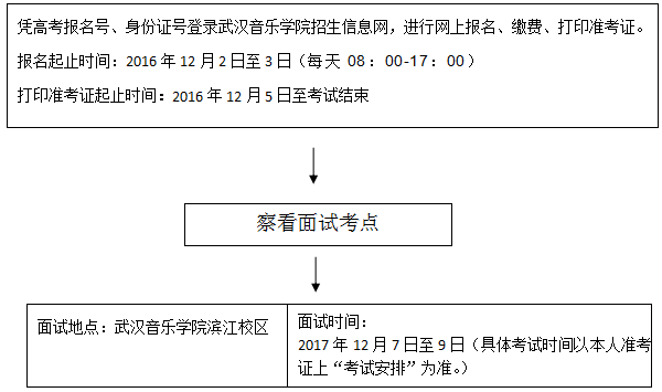 在高考網報時已選報戲劇與影視學類(表演專業)統考的考生于2016年12月2日至3日(每天08:00-17:00),憑高考報名號及身份證號登錄武漢音樂學院招生信息網進行專業統考報名,填報相關信息和網上繳費。考生必須在規定時間內完成網上報名和網上繳費,以免錯過網報時間。網報結束后,系統將自動關閉,未在規定時間內完成網上報名和網上繳費的,視為未報名,不予以安排考試。