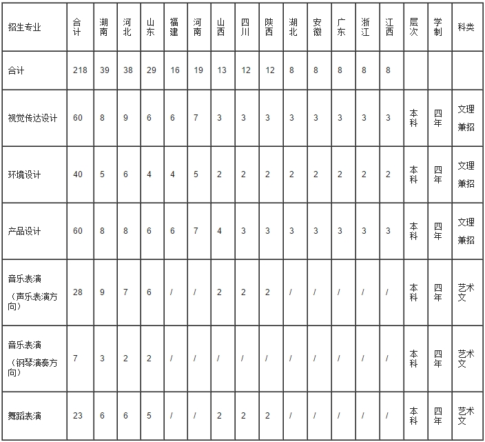 2017年我校視覺傳達(dá)設(shè)計(jì)、環(huán)境設(shè)計(jì)、產(chǎn)品設(shè)計(jì)三個(gè)設(shè)計(jì)學(xué)類專業(yè)招生計(jì)劃總數(shù)為160名,在河北、山東、福建、河南4省組織專業(yè)??颊猩?,在湖南、山西、四川、陜西、湖北、安徽、廣東、浙江、江西9省根據(jù)省級(jí)統(tǒng)考成績(jī)招生;音樂表演和舞蹈表演兩個(gè)專業(yè)招生計(jì)劃總數(shù)為58名,在湖南、河北、山東3省組織專業(yè)校考招生,在山西、四川、陜西3省根據(jù)省級(jí)統(tǒng)考成績(jī)招生。