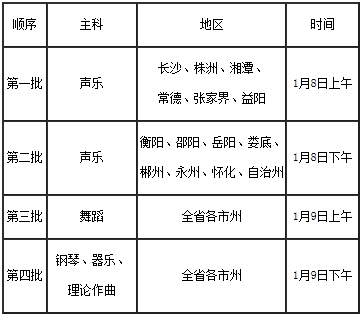 音樂類、舞蹈類專業考試于2016年1月8日至17在湖南師范大學統一進行。考生憑《2016年湖南省普通高校招生統一考試專業考試證》(以下簡稱《專業考試證》)、第二代居民身份證在規定的時間報到繳費,參加專業考試。專業考試按批次分主科門類(聲樂、舞蹈、鋼琴、器樂、理論作曲)進行,考生報到時間安排如下: