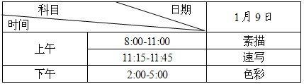 考試時間安排與普高美術類相同。2016年1月8日考生憑《專業考試證》、第二代居民身份證到湖南師范大學工程與設計學院報到繳費,參加專業考試。