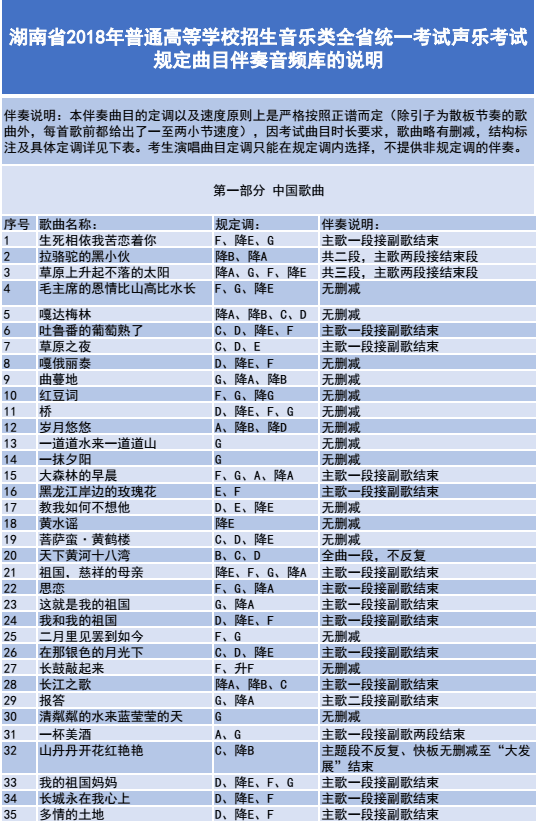 附件:1、湖南省2018年普通高等學校招生音樂類全省統一考試聲樂考試規定曲目伴奏音頻庫的說明
